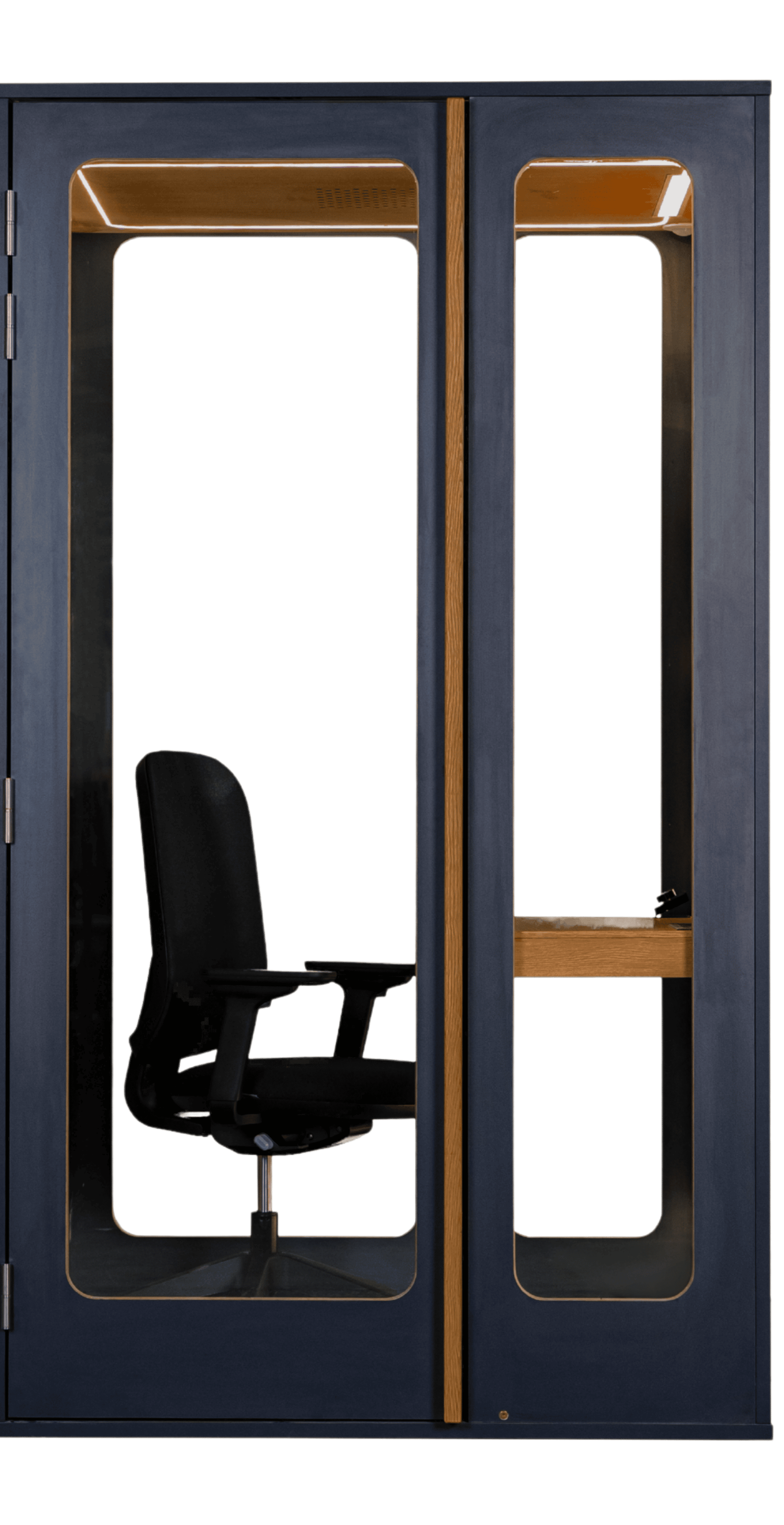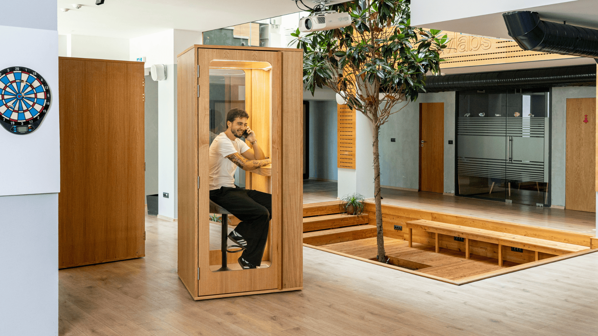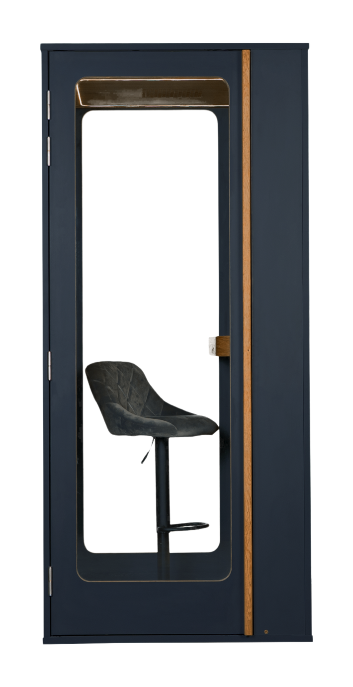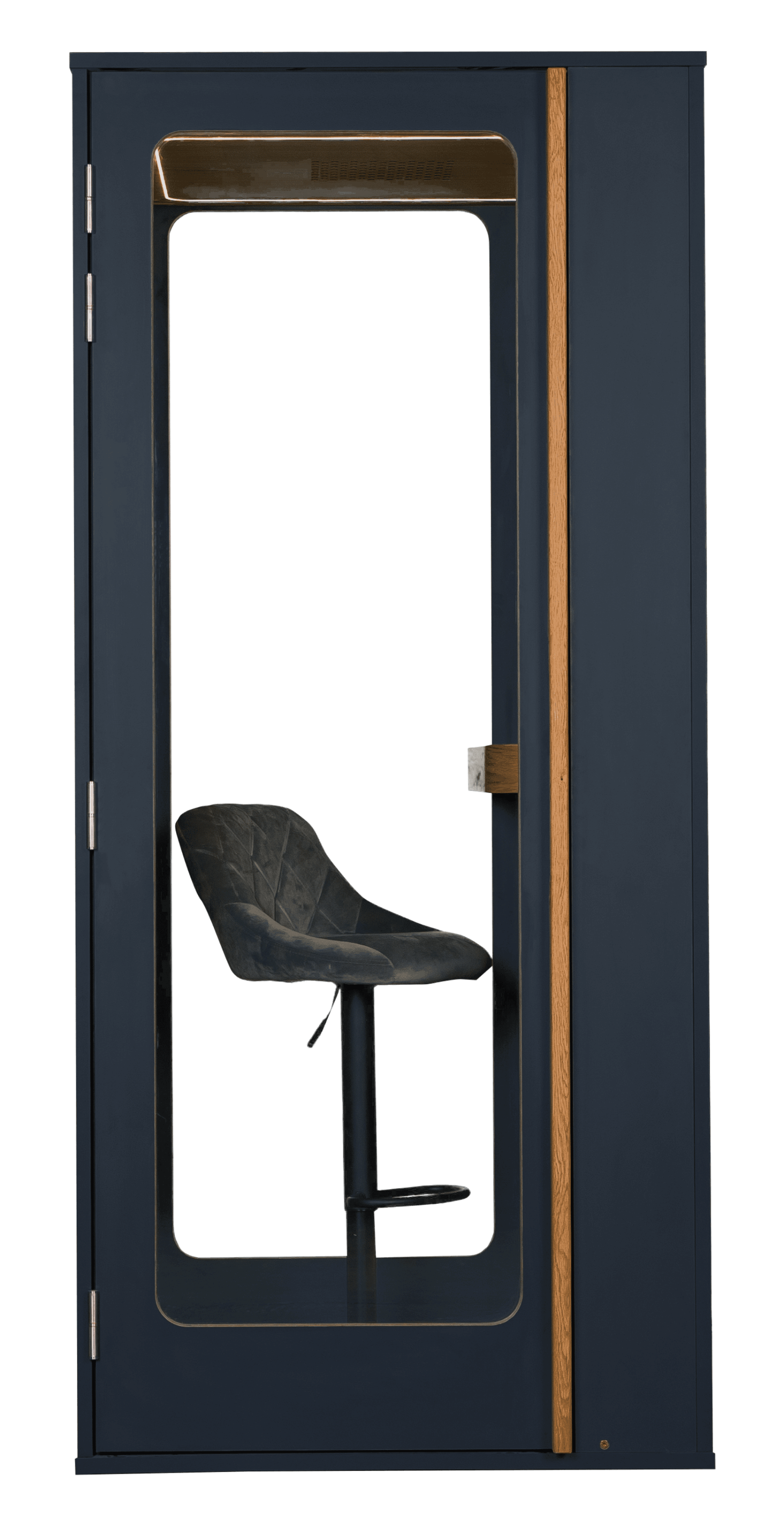 Eine Telefonzelle für eine Person, die für private Anrufe und ungestörtes Arbeiten gestaltet ist.