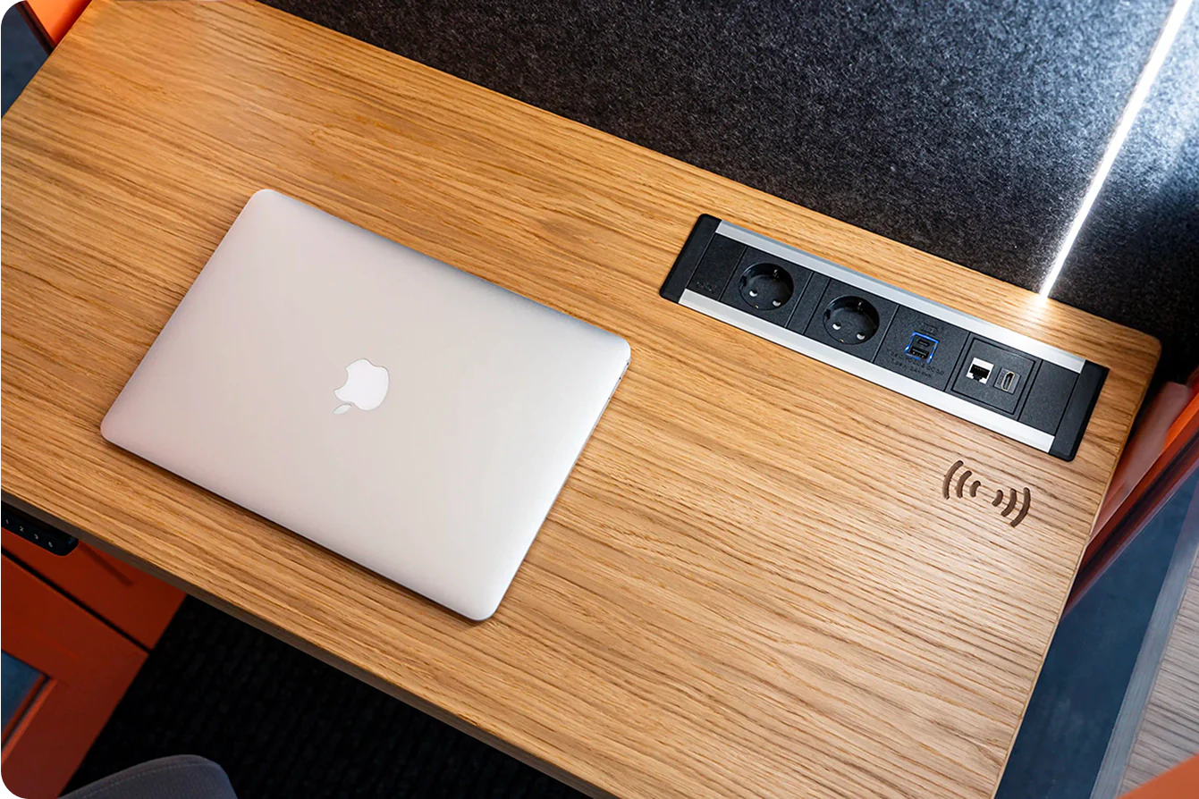Haven Focus features dual power sockets, USB-A & USB-C ports, Qi wireless charging, and a built-in monitor mount for seamless connectivity and an ergonomic workspace.